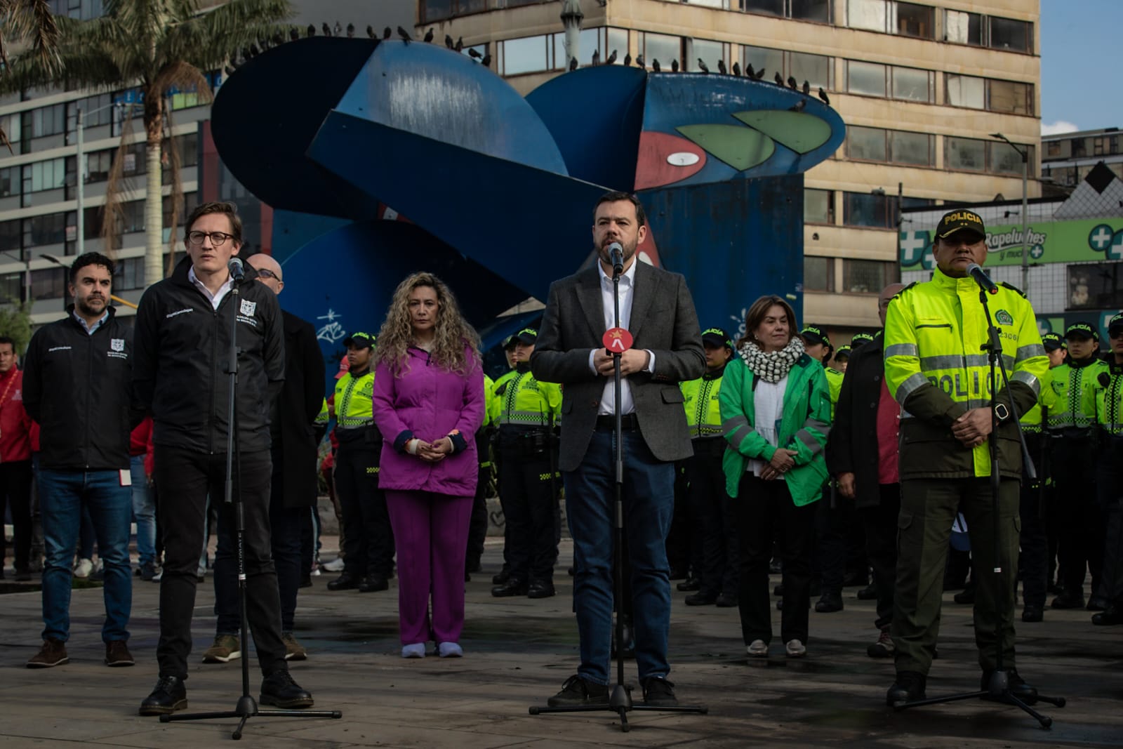 Bogotá, D.C., 20 de noviembre de 2024. El alcalde Mayor, Carlos Fernando Galán, anunció junto al general de la Policía Metropolitana (Mebog), José Daniel Gualdrón un incremento en el pie de fuerza en el centro de la ciudad, una medida clave para recuperar el orden y la seguridad en la temporada navideña y de fin de año. Este refuerzo estará acompañado por los gestores del Distrito y todo un trabajo integral que involucra a equipos de las diferentes secretarías y las Alcaldías Locales.