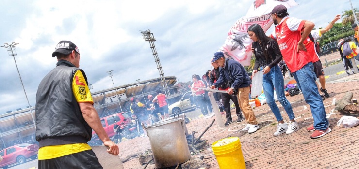 Integrantes de la Guardia Albirroja de Santa Fe recibieron con un ajiaco en los alrededores del estadio El Campín a las barras del Deportivo Pereira
