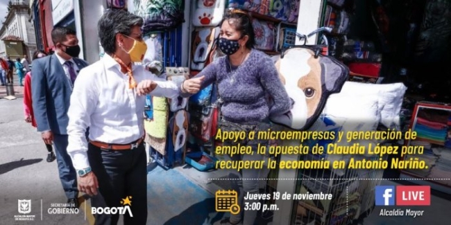 La alcaldesa Claudia López invita a todos los habitantes de la localidad de Antonio Nariño a conectarse el jueves 19 de noviembre, desde las 3:00 p.m., a la cuenta de Facebook de la Alcaldía Mayor para hablar de los apoyos al empleo y al emprendimiento en este sector de la ciudad.