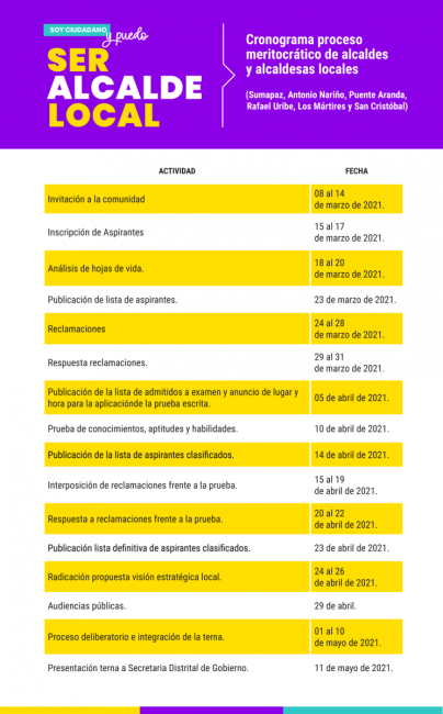 La Secretaría de Gobierno en convenio con la Universidad Nacional, una de la más reconocidas del país, inician, junto con las Juntas Administradoras Locales - JAL, la convocatoria para seleccionar a los alcaldes y alcaldesas de las localidades de Puente Aranda, San Cristóbal, Los Mártires, Sumapaz, Antonio Nariño y Rafael Uribe Uribe.