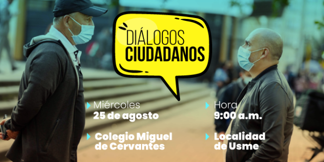 El próximo miércoles 25 de agosto, a las 9:00 a.m. en el Colegio Miguel de Cervantes Saavedra - Barrio la Marichuela (Transversal 1 c bis No 76 -77) de la localidad de Usme, las entidades del Sector Gobierno del Distrito llevarán a cabo los Diálogos Ciudadanos, una apuesta del Gobierno abierto de Bogotá, donde la ciudadanía y las entidades del sector Gobierno hablaran de importantes programas que se llevan a cabo desde el 2020 como: Bogotá Local, Somos Tejido Social y los avances en la defensa del espacio público en la ciudad, entre otros.