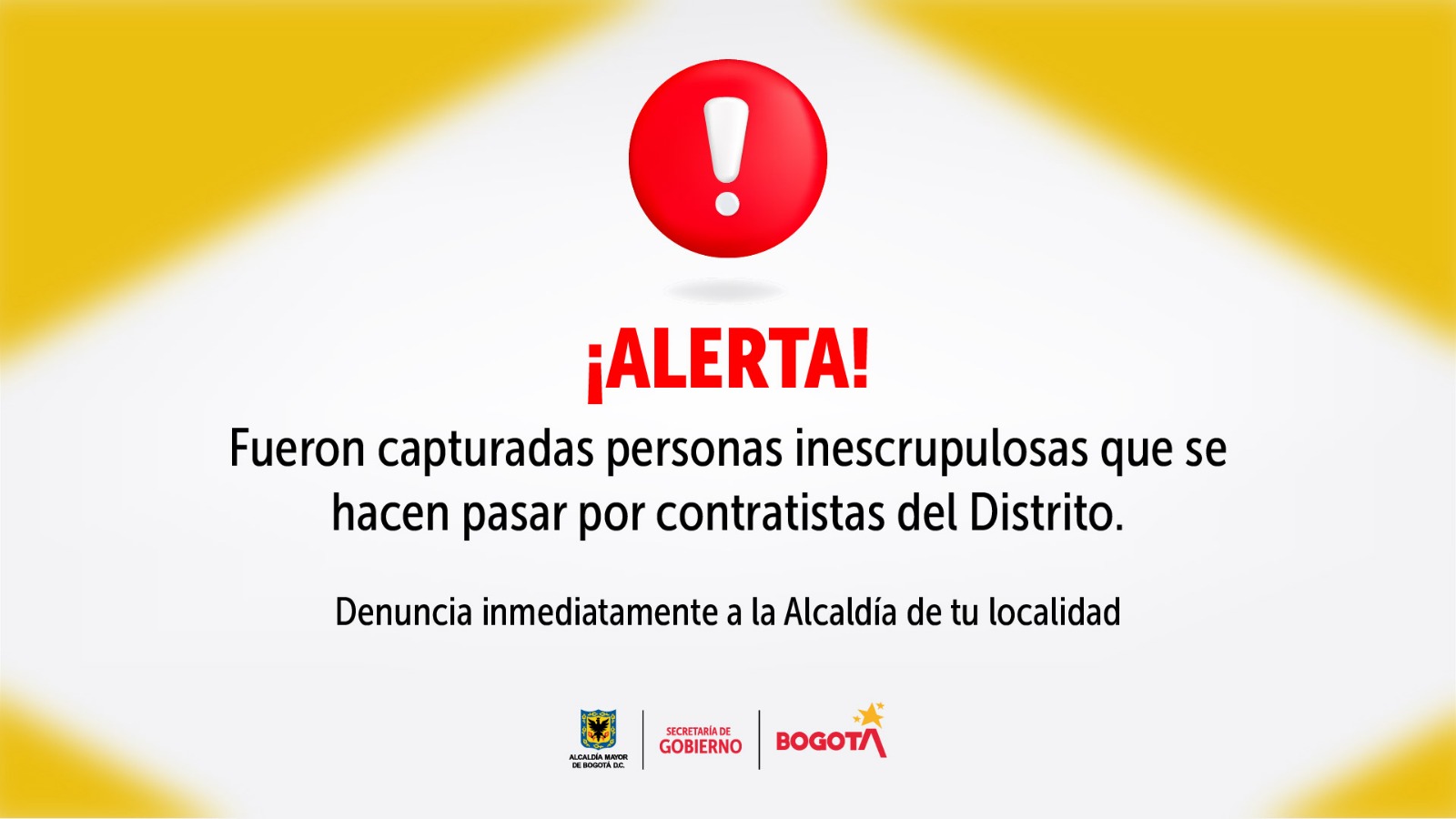 La Alcaldía Mayor de Bogotá, junto con la Secretaría de Gobierno y la Policía Metropolitana de Bogotá, alerta a los residentes y propietarios de locales comerciales en las localidades Antonio Nariño, Kennedy y Ciudad Bolívar, sobre actividades fraudulentas en la zona. Recientemente, hemos recibido algunas denuncias sobre actuaciones inescrupulosas de contratistas o de quienes se hacen pasar por estos en diferentes localidades para engañar a la gente y realizar acciones ilegales en establecimientos comerciales.