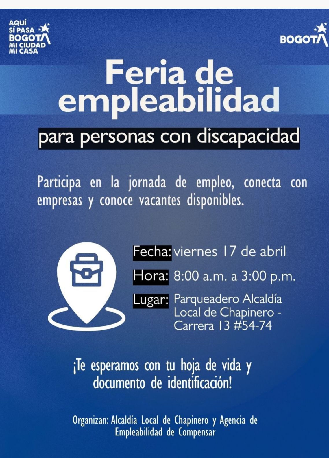 La Alcaldía Local de Chapinero, en articulación con la Agencia de Empleabilidad de Compensar, invita a la ciudadanía a participar en la Feria de Empleabilidad para personas con discapacidad, un espacio diseñado para promover la inclusión laboral en Bogotá.