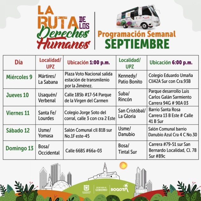 La Ruta de los Derechos humanos, operará en las localidades, con todos los protocolos de bioseguridad todos los días de la Semana de 1:00 pm a 5:00 pm y de 6:00pm a 10:00 pm. El jueves 10 de septiembre en el parque Virgen del Carmen de Usaquén (1:00 – 5:00 pm) y Luis Carlos Galán de Suba Rincón(6:00 – 10:00 pm) , el viernes 11 en Santa Fe en el Colegio Jorge Soto (1:00 – 5:00 pm) y Barrio Santa Rosa – San Cristóbal (6:00 -10:00 pm), sábado 12 en Usme Salón Comunal de Yomasa (1:00 – 5:00 pm) y Danubio (6:00 – 10:00 pm) y el domingo 13 llegará a Bosa occidental (1:00 – 5:00 pm) y Tintal sur (6:00 – 10:00 pm).